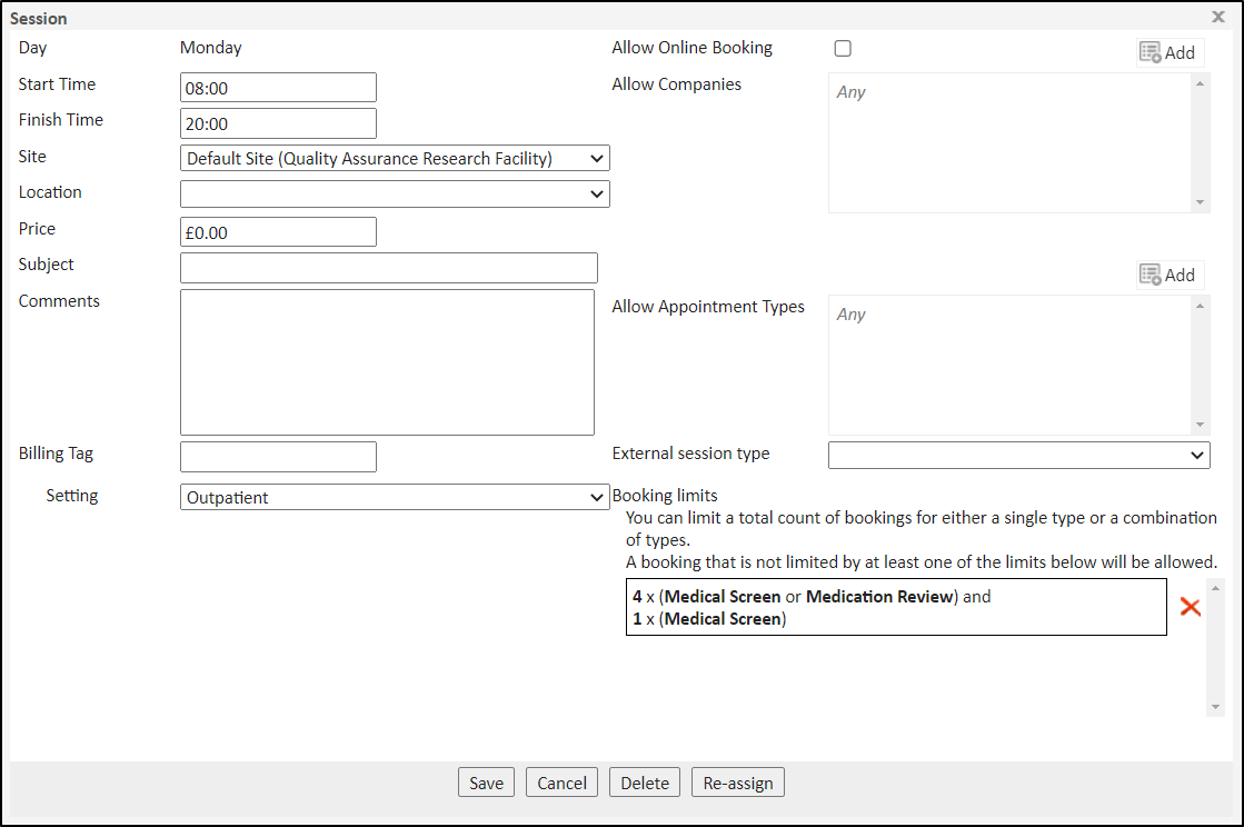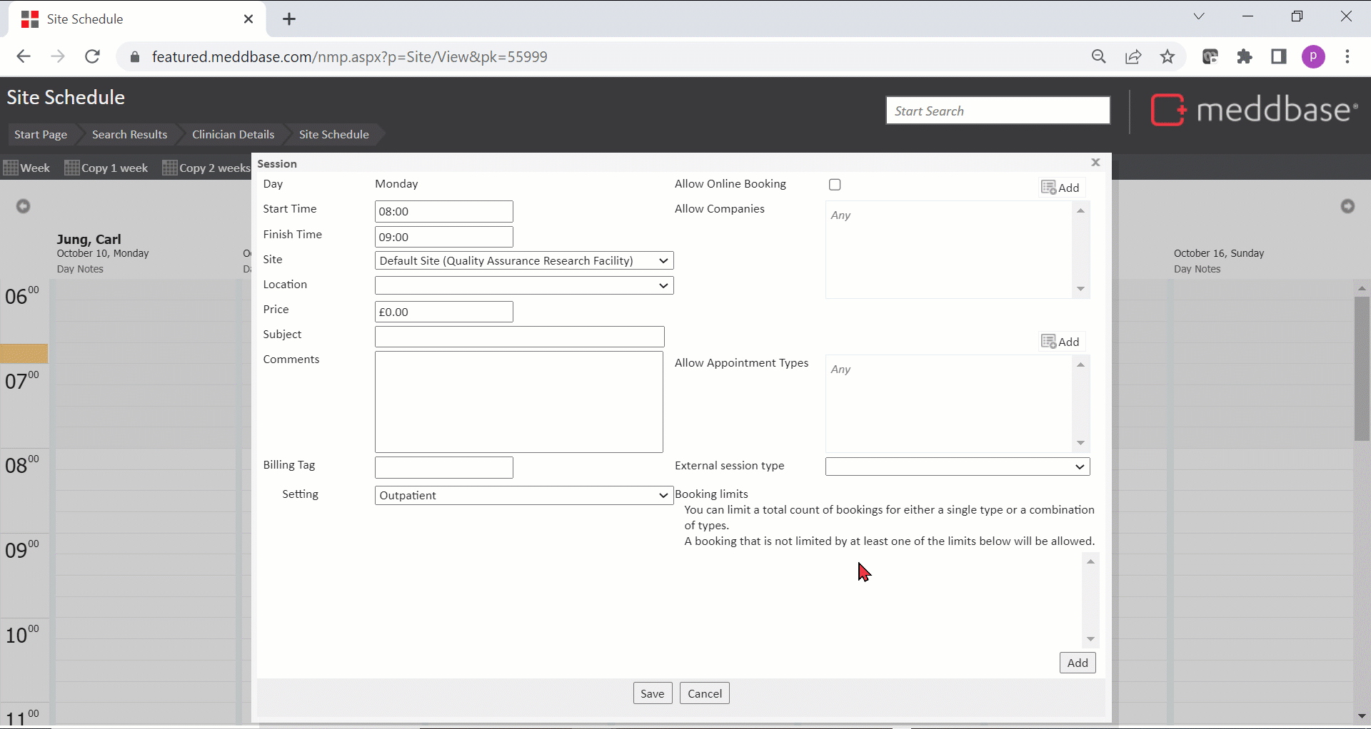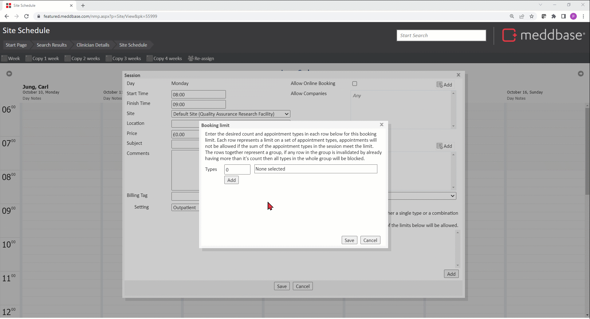 Now that the feature is enabled, let's create a Site Session for a clinician and consider the logic of configuring Booking Limits: