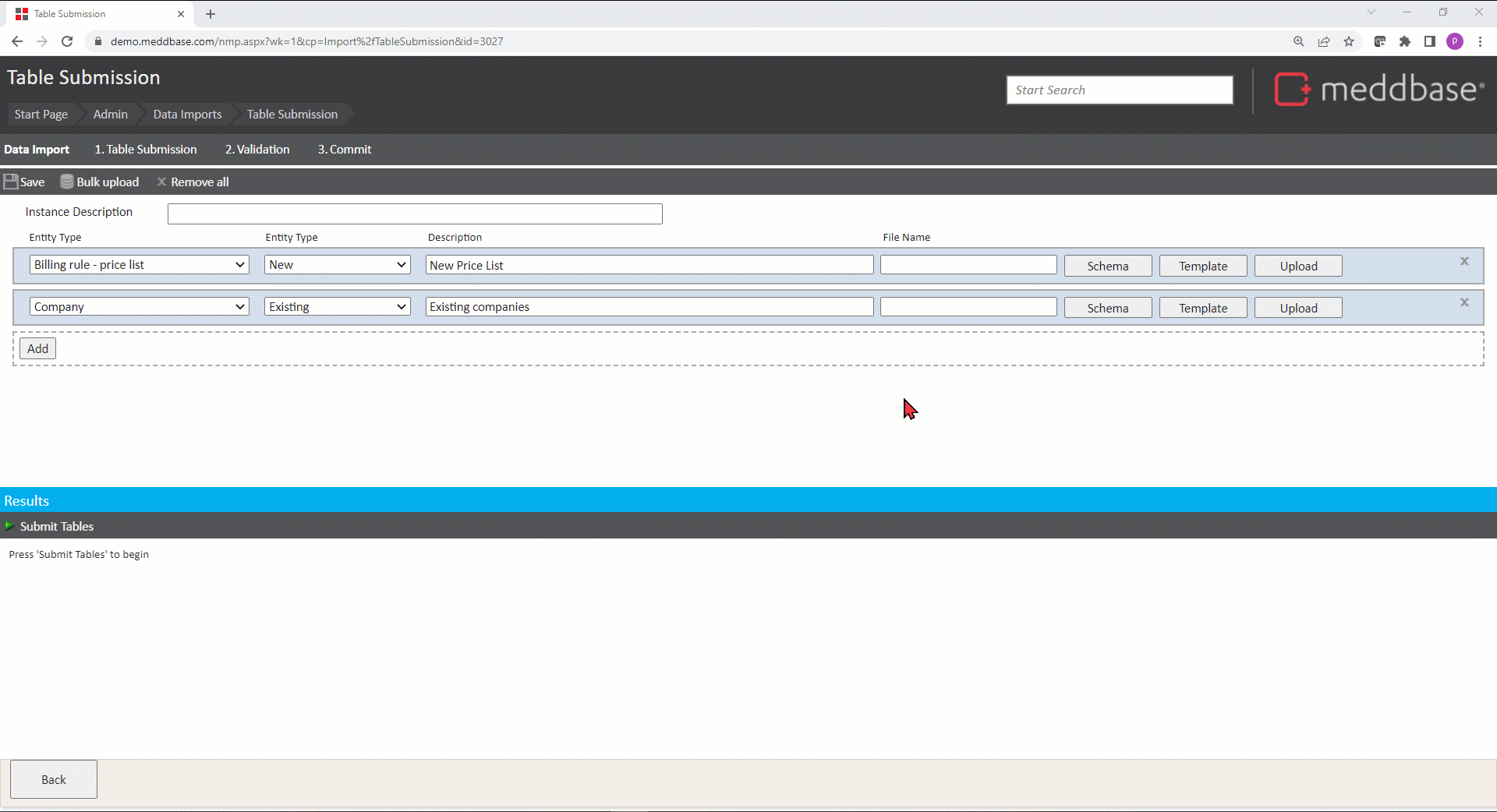 - Click Submit Tables and the system will check whether the spreadsheets you uploaded are in line with the schema(s).
