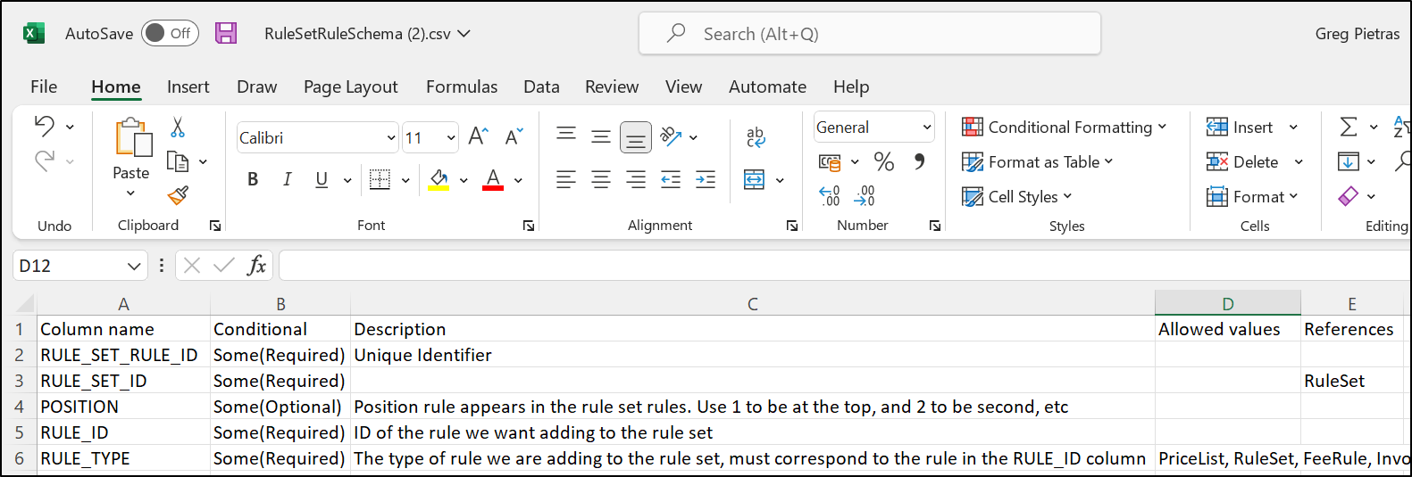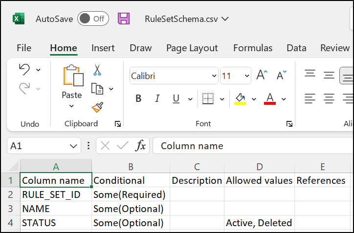 - RULE_SET_ID - this column references an existing entity: a Rule Set, which means we must upload a spreadsheet for that entity in line with its respective Schema.