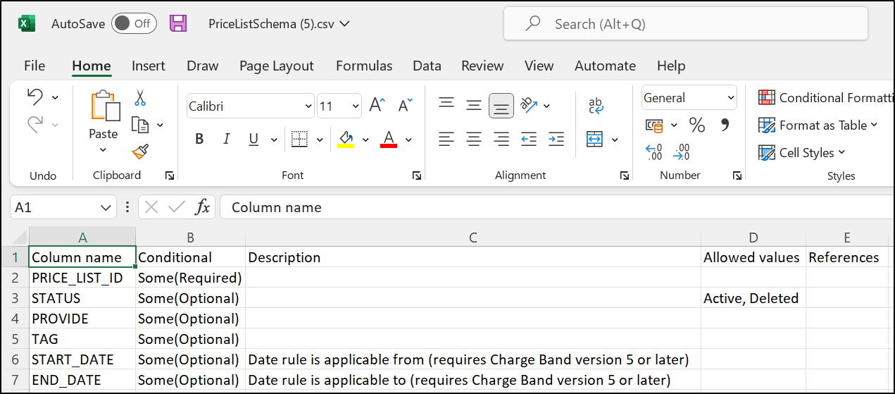 - RULE_ID - this column references an existing entity: a Billing Rule (Price List in this example), which means we must upload a spreadsheet for that entity in line with its respective Schema.